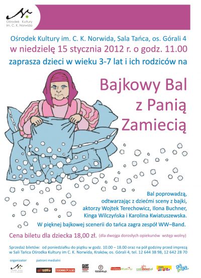 Cena biletu dla dziecka 18,00 zł. ( dla dwojga dorosłych opiekunów wstęp wolny). Sprzedaż biletów od poniedziałku do pištku w godzinach 10.00 18.00 w Sali Tańca Orodka Kultury im. C. K. Norwida, os. Górali 4, Kraków, tel. 12-644-38-98, 12-642-28-70.