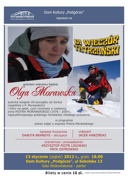 W ramach Podgórskiej Sceny Poezji gociem wieczoru będzie Olga Morawska autorka ksišżek : Od poczštku do końca (wspólnie z P. Morawskim) i Góry na opak, czyli rozmowy o czekaniu, żona Piotra Morawskiego (1976 2009), polskiego himalaisty młodego pokolenia.