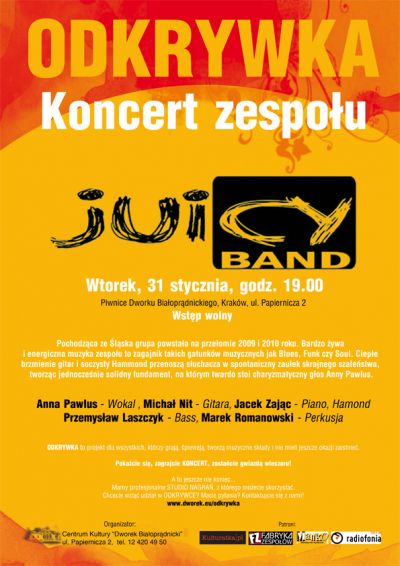 Na scenie wystšpi pochodzšcy ze lšska skład JUICY BAND. Grupa powstała na przełomie 2009 i 2010 roku. Bardzo żywa i energiczna muzyka zespołu to zagajnik takich gatunków muzycznych jak Blues, Funk czy Soul. Ciepłe brzmienie gitar i soczysty Hammond przenoszš słuchacza w spontaniczny zaułek skrajnego szaleństwa, tworzšc jednoczenie solidny fundament, na którym twardo stoi charyzmatyczny głos Anny Pawlus.