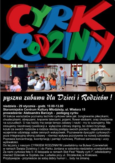 w niedzielę 29 stycznia o godz. 10.00-13.00 na CYRK RODZINNY pysznš zabawę dla dzieci i rodziców!
