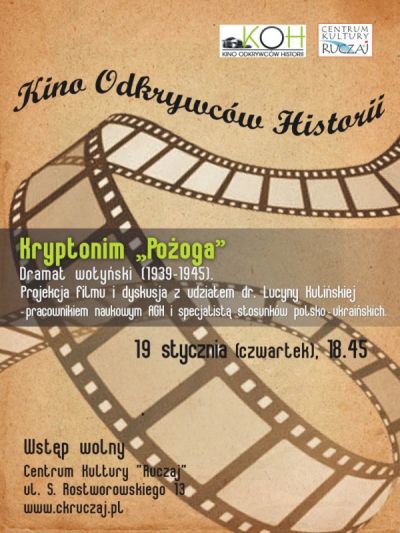 W najbliższy czwartek 19 stycznia 2012 zapraszamy do Centrum Kultury "Ruczaj" na kolejne spotkanie z cyklu Kino Odkrywców Historii. Tym razem zostanie zaprezentowany film "Kryptonim "Pożoga". Dramat wołyński (1939-1945)".