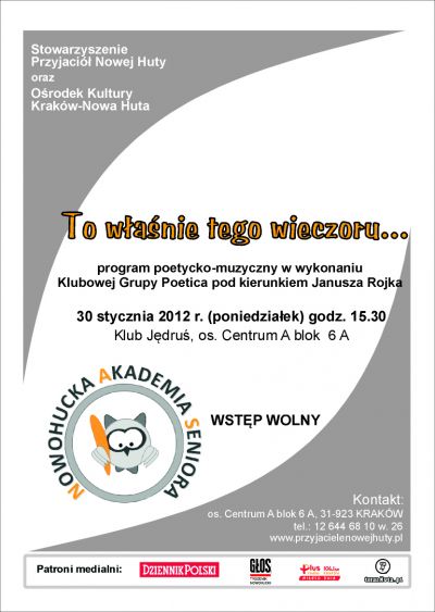 Stowarzyszenie Przyjaci Nowej Huty i Orodek Kultury Krakw-Nowa Huta zapraszaj, w ramach Nowohuckiej Akademii Seniora, na refleksyjny program poetycko muzyczny, mwicy o treciach zawartych w przesaniu boonarodzeniowym, poczony ze wsplnym koldowaniem. Wystpi Klubowa Grupa Poetica z Klubu Dukat.