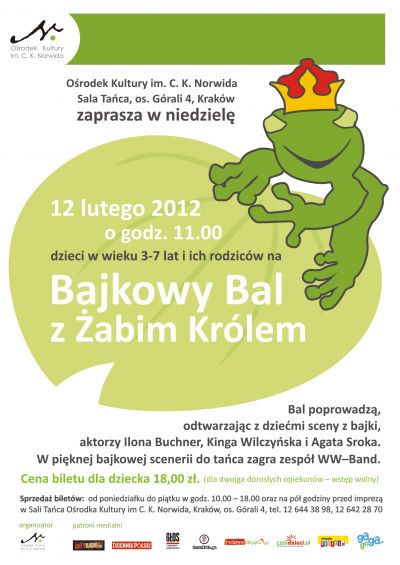 Cena biletu dla dziecka 18,00 zł. ( dla dwojga dorosłych opiekunów wstęp wolny). Sprzedaż biletów od poniedziałku do pištku w godzinach 10.00 18.00 w Sali Tańca Orodka Kultury im. C. K. Norwida, os. Górali 4, Kraków, tel. 12-644-38-98, 12-642-28-70.