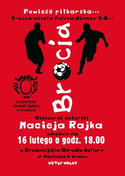 16 lutego o godz.18.00 w ródmiejskim Orodku Kultury w Krakowie (ul. Mikołajska 2) odbędzie się spotkanie autorskie z młodym pisarzem Maciejem Rajkiem, powięcone jego powieci Bracia - PIERWSZEJ POWIECI PIŁKARSKIEJ W POLSCE.