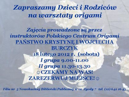 Warsztaty origami odbywajš się w Filii nr 5 Nowohuckiej Biblioteki Publicznej cyklicznie, dzięki współpracy z instruktorami Polskiego Centrum Origami. Cieszš się niesłabnšcym zainteresowaniem czytelników. Okres ferii sprzyja kolejnemu zaproszeniu do udziału w zajęciach. Oferta kierowana jest do wszystkich, którzy ten wolny od nauki czas spędzajš w mieœcie.