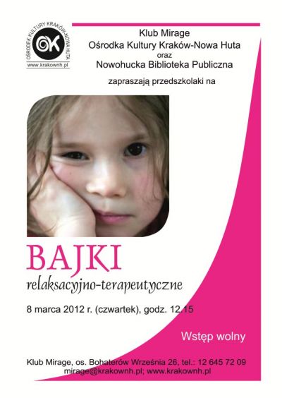 Zapraszamy przedszkolaki do Klubu Mirage Orodka Kultury Krakw-Nowa Huta na cykliczn imprez prowadzon przez Nowohuck Bibliotek Publiczn. S to zajcia edukacyjno relaksacyjne z elementami dramy i wicze oddechowych oraz polegajce na czytaniu i analizie bajek.