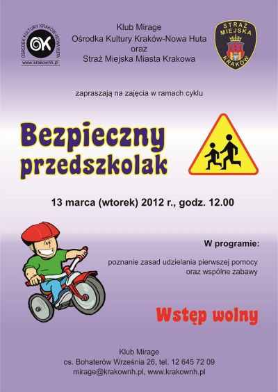 Klub Mirage Oœrodka Kultury Kraków-Nowa Huta (os. Bohaterów Wrzeœnia 26) zaprasza 13 marca (wtorek) 2012 r. o godz. 12.00 na kolejne spotkanie dla maluszków ze Strażš Miejskš z zakresu bezpieczeństwa i unikania zagrożeń.