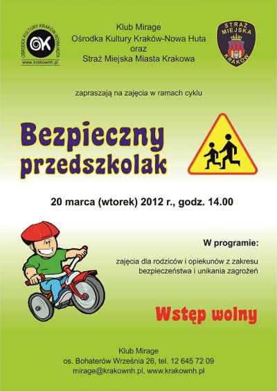 Klub Mirage Oœrodka Kultury Kraków-Nowa Huta (os. Bohaterów Wrzeœnia 26) zaprasza 20 marca (wtorek) 2012 r. o godz. 14.00 na kolejne zajęcia z cyklu Bezpieczny Przedszkolak.