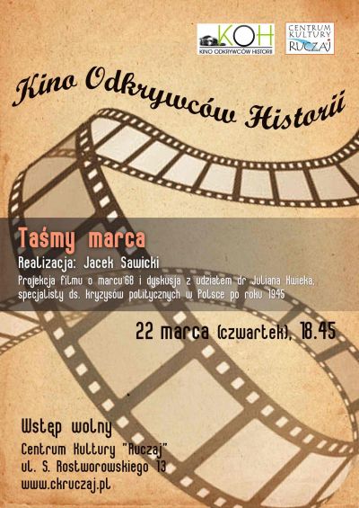 22 marca (czwartek) o godz. 18:45 zostanie zaprezentowany film "Tamy marca" o marcu '68. Po projekcji zapraszamy do dyskusji z udziałem dr Juliana Kwieka, specjalisty ds. kryzysów politycznych w Polsce po roku 1945.