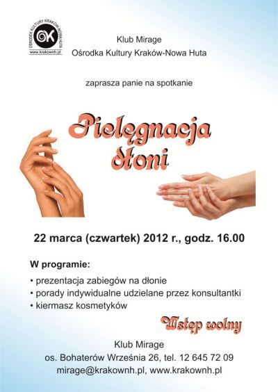 Spotkanie w Klubie Mirage Oœrodka Kultury Kraków-Nowa Huta dla osób chcšcych zadbać o piękne dłonie na wiosnę. W programie: indywidualne porady kosmetyczne prezentacja zabiegów na dłonie oraz kiermasz kosmetyków.