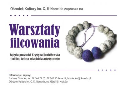 Zapraszamy osoby poczštkujšce, ale także takie, które majš podstawy już za sobš. Na naszych zajęciach wykonujemy biżuterię i przedmioty z filcu, awangardowš biżuterię z czesanki wełnianej - naszyjniki z kulek filcowanych na mokro oraz naszyjniki z dredów, koralików, sznurka, drucika wykonane różnymi technikami.
