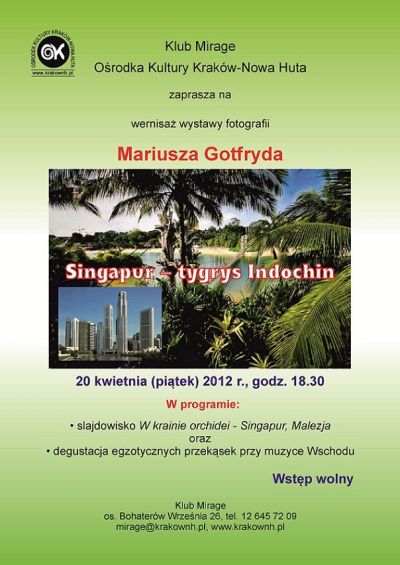 Klub Mirage Oœrodka Kultury Kraków-Nowa Huta (os. Bohaterów Wrzeœnia 26) zaprasza na otwarcie wystawy fotografii Mariusza Gotfryda Singapur - tygrys Indochin.