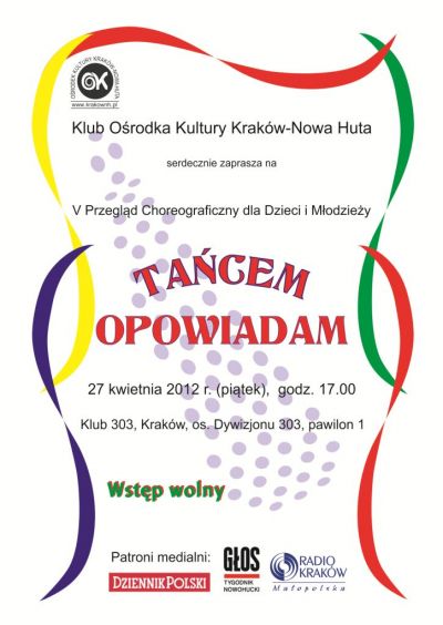 Klub Oœrodka Kultury Kraków-Nowa Huta zaprasza, z okazji Międzynarodowego Dnia Tańca, na prezentację twórczoœci choreograficznej dzieci. Uczestnikami przeglšdu sš miedzy innymi dzieci bioršce udział w zajęciach tanecznych w klubach Oœrodka Kultury Kraków – Nowa Huta. Pomysłodawczyniš przeglšdu jest choreograf baletu Barbara Gatty – Kostyal. Regulamin i kartę zgłoszenia można otrzymać w Klubie (os. Zgody 1) od poniedziałku do pištku w godz. od 9.00-19.00 lub pobrać ze strony Oœrodka - zapisy do dnia 24 kwietnia 2012 r.