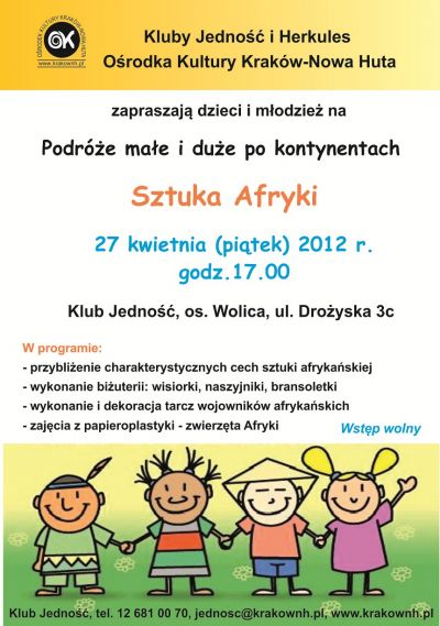 Klub Jednoœć Oœrodka Kultury Kraków-Nowa Huta (ul. Drożyska 3c) zaprasza na kolejne spotkanie z cyklu Podróże małe i duże, którego celem jest przybliżenie dzieciom kultur innych krajów, poprzez różnorodne działania plastyczne, muzyczne, teatralne.