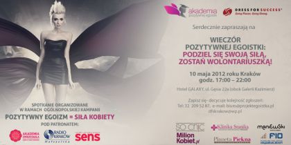 10 maja 2012 roku w krakowskim Hotelu Galaxy odbędzie się konferencja „Wieczór Pozytywnej Egoistki: podziel się swojš siłš, zostań wolontariuszkš”. To pierwsze takie przedsięwzięcie skierowane tylko i wyłšcznie do kobiet, które promuje pozytywny egoizm jako nowy styl życia oraz ideę wolontariatu. Kobiety w trakcie konferencji dowiedzš się jak odkryć i rozwijać wewnętrznš siłę, a następnie jak się tš siłš dzielić i wzmacniać poprzez pomaganie innym kobietom.