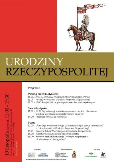 W programie m.in.: salwy wiwatowe, pokazy walki szablš, przejażdżki zabytkowymi samochodami, gry, prelekcje, konkurs na "Toast dla Rzeczypospolitej" oraz koncert Jacka Kowalskiego i Henryka Kasperczaka!!!