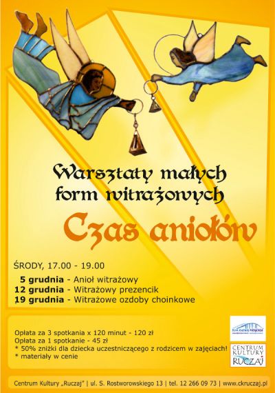 Przy pomocy różnych elementów: szkła, drewna, blachy miedzianej i drutu uczestnicy wykonajš formy witrażowe płaskie i przestrzenne: anioły i ozdoby na choinkę, które będš pięknš ozdobš na więta w każdym domu.