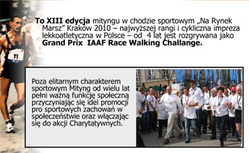 Mityng Grand Prix IAAF Walking Challenge rozpocznie się o 18, tuż po ogłoszeniu wyników wspólnego chodu. Jak co roku spodziewamy się największych gwiazd chodziarstwa ze wszystkich zakątków naszej planety, które zapewne znów dostarczą nam emocji na najwyższym, światowym poziomie. Wystarczy przypomnieć, że w zeszłym roku został pobity rekord świata, żeby mieć nadzieje na podobne rezultaty w tym roku. Chodziarze na krakowskim Mityngu będą zdobywać punkty do ogólnej punktacji IAAF Walking Challenge.