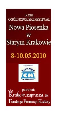 Centrum Młodzieży im. dr H. Jordana oraz Studio Piosenki "Pawix Music" zapraszają w dn. 8-10 maja br. na XXIII Ogólnopolski Festiwal „Nowa Piosenka w Starym Krakowie", nad którym honorowy patronat, po raz kolejny, objął Rektor Akademii Muzycznej w Krakowie, prof. Stanisław Krawczyński.