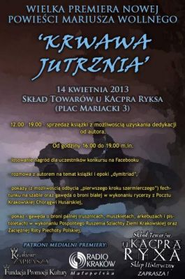 Skład Towarów u Kacpra Ryksa oraz Mariusz Wollny zapraszają serdecznie na uroczystą premierę jego nowej powieści pt. „Krwawa Jutrznia”. Autor znany głównie z serii książek o XVI-wiecznym Inwestygatorze Królewskim Kacprze Ryksie tym razem bierze na warsztat wydarzenia słynnych „dymitriad”, w które (wbrew swojej woli) wplątany zostaje syn Kacpra, Ryx Junior…