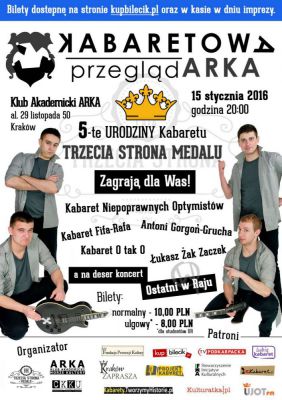 Tym razem zapraszamy Was do wspólnego świętowania naszego małego jubileuszu!Styczniowa edycja odbędzie się pod znakiem V urodzin Kabaretu Trzecia Strona Medalu. Z tej okazji przygotowaliśmy dla was specjalny program z udziałem naszych przyjaciół.