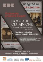 12 luty 2016 godz. 18:00 Sala Widowiskowa Domu Kultury „Podgórze” - Krakowska premiera książki Joanny Siedleckiej :”Biografie odtajnione. Z archiwów literackich bezpieki” (ZYSK i Sp.2015 ) z udziałem autorki.