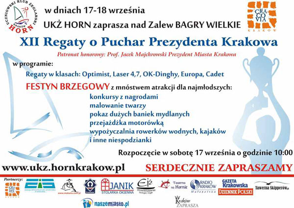 W dniach 17-18 września 2011 roku odbędzie się XII edycja REGAT ŻEGLARSKICH o Puchar Prezydenta Miasta Krakowa, dedykowanych dla dzieci, młodzieży i dorosłych.
