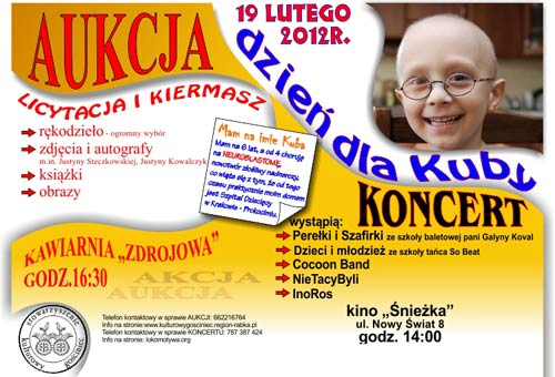 Dlatego w Rabce (skąd pochodzi tata chłopca) przygotowywana jest wspomniana aukcja. W tym momencie mamy już ponad 250 przedmiotów rękodzielniczych, które spływają do nas z całej Polski – mówi koordynatorka aukcji Agata Stasik ze Stowarzyszenia Kulturowy Gościniec. Wszystkie te przedmioty przekazywane są za darmo przez chcących nieść pomoc rękodzielników, którym za to w imieniu Kuby serdecznie dziękuję. Każda rzecz jest katalogowana, numerowana i fotografowana. Wszystkie zasilą aukcje oraz kiermasz - dodaje. Wśród nadesłanych przedmiotów są oryginalne kolczyki, bransoletki, szale wykonane na szydełku, ceramika, maskotki a także przedmioty dekoracyjne i użytkowe. Ku radości organizatorów akcję wsparła Justyna Steczkowska, która ofiarowała na nią fotografię swojego autorstwa oraz własne zdjęcie z autografem. Do akcji włączyli się też artyści z Rabki: malarka Ewa Łaczek-Daleki przekazała pejzaż wykonany technika mieszaną, Piotr Kolecki rysunek a Jerzy Treit z Mszany Dolnej cztery pastele. Na aukcje trafiły także fotografie autorstwa Jakuba i Jana Cieplińskich. Licytować można będzie również autografy Justyny Kowalczyk, Kamila Stocha i Klimka Murańki. Jak widać przekrój zgromadzonych przedmiotów jest bardzo urozmaicony co daje gwarancje ze każdy znajdzie tam coś dla siebie pomagając przy tym Kubusiowi.