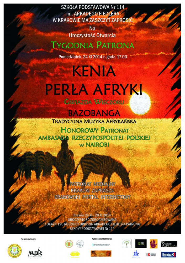 Dyrekcja, nauczyciele i cała społeczność szkolna serdecznie zapraszają na uroczystość otwarcia Tygodnia Kultury Kenii, które nastąpi w poniedziałek 24 listopada 2014 roku o godz. 17.00 w Szkole Podstawowej nr 114 przy ul. Łąkowej 31 w Krakowie.