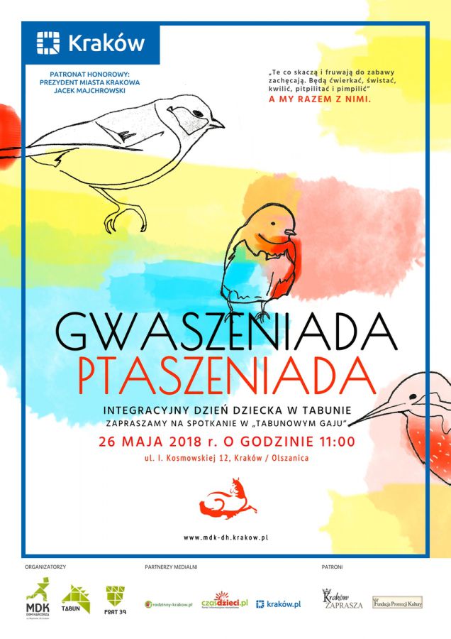 26 maja 2018 roku na terenie ORiRK Tabun, ul. I. Kosmowskiej 12 w Krakowie odbędzie się Integracyjny Dzień Dziecka pod nazwą Gwaszeniada – Ptaszeniada.