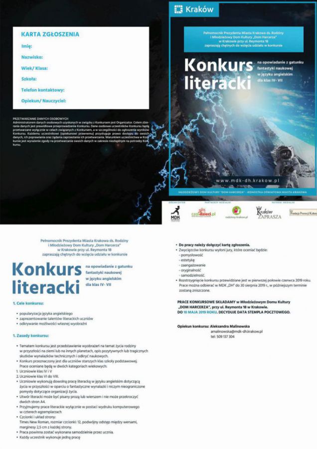 Zapraszamy do udziału w konkursie literackim na opowiadanie o rodzinie. Konkurs przeprowadzany jest w języku angielskim, a opowiadanie ma należeć do gatunku fantastyki naukowej. 23 kwietnia do 10 maja 2019