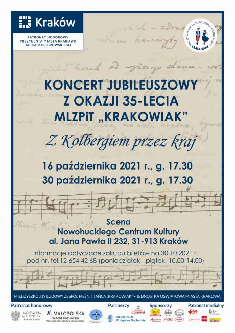 Międzyszkolny Ludowy Zespół Pieśni i Tańca „Krakowiak” świętuje 35 lat działalności artystyczno-wychowawczej. Publiczność zyska sporą dawkę wspaniałej zabawy. Ze sceny popłyną skoczne dźwięki, a oczom widzów ukarzą się artyści prezentujący swój dotychczasowy dorobek. Wydarzenie, w formie widowiska muzyczno-teatralnego, prócz warstwy estetycznej, posiada także wymiar edukacyjny. Koncert, zatytułowany „Z Kolbergiem przez kraj”, da sposobność zapoznania się z dawnymi tradycjami i obrzędami obecnymi w ówczesnych polskich chatach. Na scenie ujrzymy prawie 200 tancerzy, tryskających wigorem, płynącym z pasji do folkloru... A to wszystko już 16 października w Nowohuckim Centrum Kultury. Początek 17.30. Drugi raz taka okazja zdarzy się dwa tygodnie później, 30 października, o tej samej porze i w tym samym miejscu.