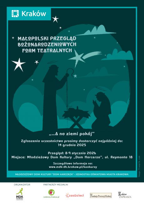 Młodzieżowy Dom Kultury „Dom Harcerza” przy ul. Reymonta 18 w Krakowie zaprasza do udziału w Małopolskim Przeglądzie Bożonarodzeniowych Form Teatralnych „… A na ziemi pokój” 2026, który odbędzie się 8 i 9 stycznia 2026 r.