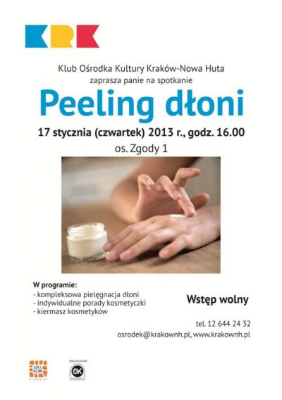 Zapraszamy panie do Klubu Ośrodka Kultury Kraków-Nowa Huta na spotkanie dotyczące pielęgnacji dłoni. W programie spotkania: kompleksowa pielęgnacja dłoni, indywidualne porady kosmetyczki oraz kiermasz kosmetyków. Współorganizatorem spotkania jest Koło nr 24 PZERiI.