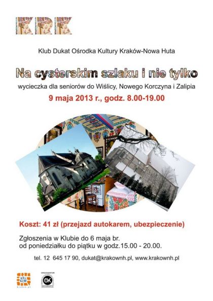 Zgłoszenia do 6 maja w Klubie Dukat Ośrodka Kultury Kraków-Nowa Huta od poniedziałku do piątku w godz. 15.00-20.00. Koszt: 41 zł (w tym przejazd autokarem, opieka i ubezpieczenie).