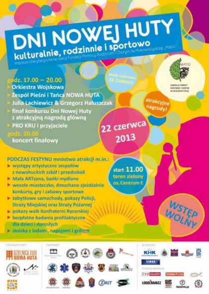 Zapraszamy na DNI NOWEJ HUTY – rodzinną, sąsiedzką i wielopokoleniową imprezę plenerową, która odbędzie się w sobotę 22 czerwca na terenie zielonym pomiędzy NCK a Centrum E. Impreza rozpocznie się o godzinie 11.00 a zakończy koncertem zespołu muzycznego około godziny 21.30.