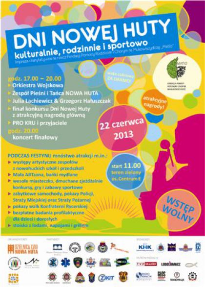 Zapraszamy na DNI NOWEJ HUTY – rodzinną, sąsiedzką i wielopokoleniową imprezę plenerową, która odbędzie się w sobotę 22 czerwca na terenie zielonym pomiędzy NCK a Centrum E. Impreza rozpocznie się o godzinie 11.00 a zakończy koncertem zespołu muzycznego około godziny 21.30.