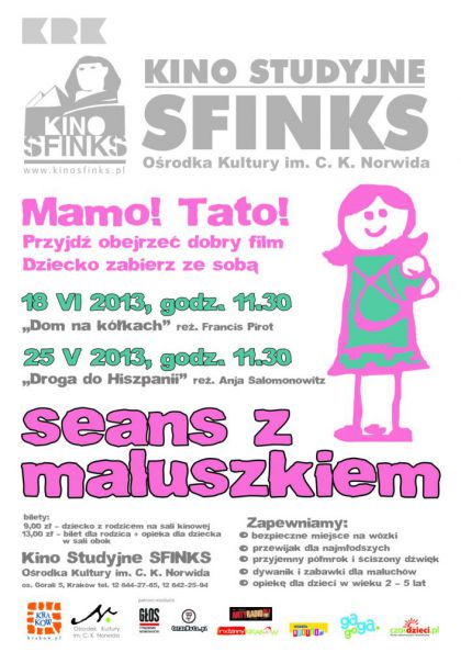 Podczas cyklu SEANS Z MALUSZKIEM proponujemy wspólne, dopołudniowe projekcje dobrych filmów, na które zapraszamy rodziców wraz z dziećmi gwarantując szczególnie dobrany repertuar (kino o wysokich walorach zdjęciowych i muzycznych, bez scen przemocy), opiekę dla dzieci w wieku 2-4 lat, zaplecze organizacyjne przyjazne rodzicom (przewijak dla najmłodszych, bezpieczne miejsce na wózki) a także przyjemny półmrok na sali kinowej i ściszony dźwięk dla tych rodziców, którzy zechcą oglądnąć film w towarzystwie swojej pociechy. Spotkania odbywają się w Kinie Sfinks dwa razy w miesiącu, w godzinach dopołudniowych.