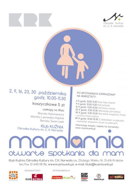 Macierzyństwo jest czasem pięknym, ale także trudnym, warto poszukać rady i wsparcia, tych, którzy to rozumieją. Wanda Hałuniewicz, Monika Lipowska-Hajduk i Renata Świerczek, będą się starały stworzyć miejsce przyjazne i ciepłe. W październiku zaprosimy do poprowadzenia spotkań Jolę Walczyk z portalu Ekorodzice, która opowie o domu bez chemii, pokaże, że wcale nie jest trudno zdrowo i ekologicznie dbać o rodzinę. Będzie też Tomek Poniży, aktor, klaun i instruktor teatralny, który poradzi, jak wybierać mądre, dobre książeczki dla dzieci.