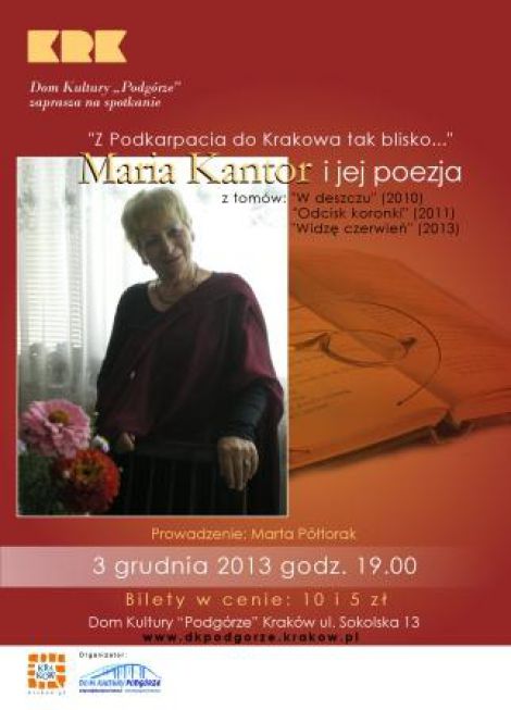 3 grudnia w DK Podgórze odbędzie się spotkanie z poezja Marii Kantor – krakowskiej poetki pochodzącej z Podkarpacia.