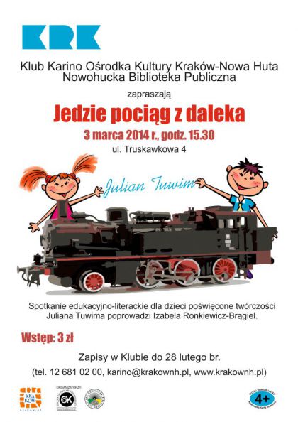 Lokomotywa, Ptasie Radio, Rzepka - to wiersze Juliana Tuwima, które zna każdy z nas. Teksty poety to nie tylko genialne wiersze do czytania, ale także utwory dające możliwość niekonwencjonalnych interpretacji. Szansę niecodziennego odczytania dzieł Tuwima będą miały dzieci podczas spotkania edukacyjno-literackiego, na które zapraszają: Klub Karino Ośrodka Kultury Kraków-Nowa Huta i Nowohucka Biblioteka Publiczna.