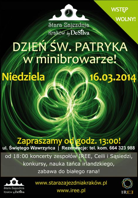 Organizatorzy ze Starej Zajezdni zapraszają fanów kultury i muzyki irlandzkiej oraz wszystkich lubiących dobrą zabawę. Przygotowano liczne konkursy, warsztaty tańca irlandzkiego, specjalne menu i zielone piwo. Nie zabraknie oczywiście również irlandzkiej whiskey. Lá Fhéile Pádraig Sona Daoibh!