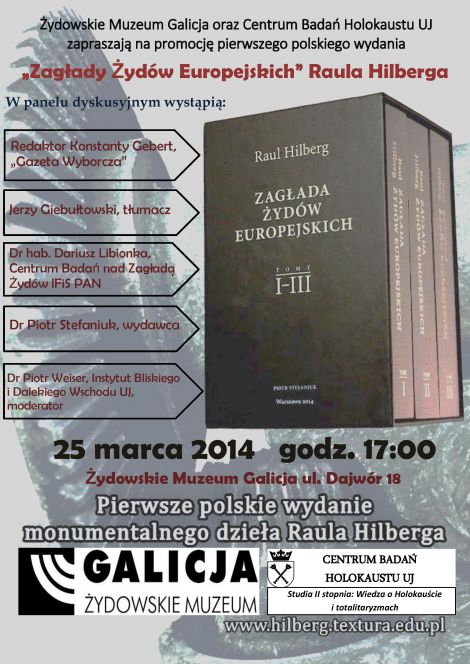 Krakowska premiera monografii Hilberga odbędzie się 25.03 o godzinie 17:00. W dyskusji udział wezmą: redaktor Konstanty Gebert, Jerzy Giebułtowski (tłumacz), dr Piotr Stefaniuk (wydawca)dr hab. Dariusz Libionka (Centrum badań nad Zagładą Żydów IFiS PAN) spotkanie moderował będzię dr Piotr Weiser z Instytutu Bliskiego i Dalekiego Wschodu UJ. Organizatorami spotkania są Centrum Badań Holokaustu UJ oraz Żydowskie Muzeum Galicja.