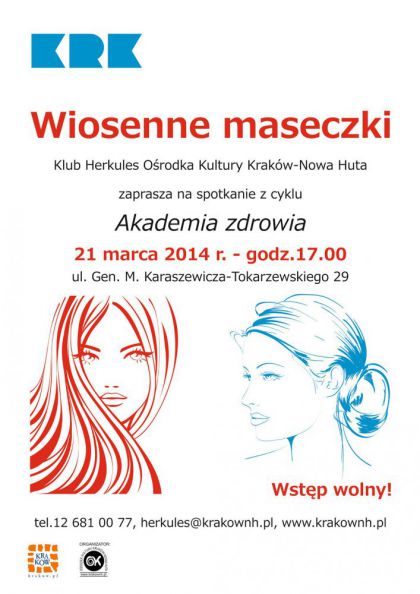 Klub Herkules Ośrodka Kultury Kraków-Nowa Huta (ul. Gen. M. Karaszewicza-Tokarzewskiego 29) zaprasza 21 marca o godz. 17.00 na spotkanie dla pań z konsultantkami kosmetycznymi w ramach cyklu Akademia zdrowia.
