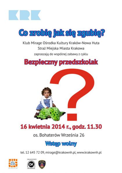dzieci dowiedzą się, do jakich osób powinny się zgłosić o pomoc, gdy zgubią się w sklepie, na ulicy, czy na plaży i dlaczego tak ważna jest znajomość swojego nazwiska oraz adresu zamieszkania. Będzie to też dobra okazja, aby przedszkolaki powtórzyły informacje poznane na dotychczasowych zajęciach prowadzonych przez Straż Miejską Miasta Krakowa.
