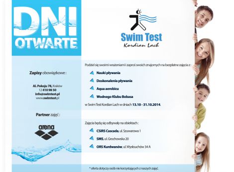 Dni otwarte Swim Test Kordian Lach od 13 do 31 października 2014. Obowiązkowe zapisy w BOK Swim Test: al. Pokoju 78, Kraków, info@swimtest.pl. Partnerem zajęć jest ARENA.