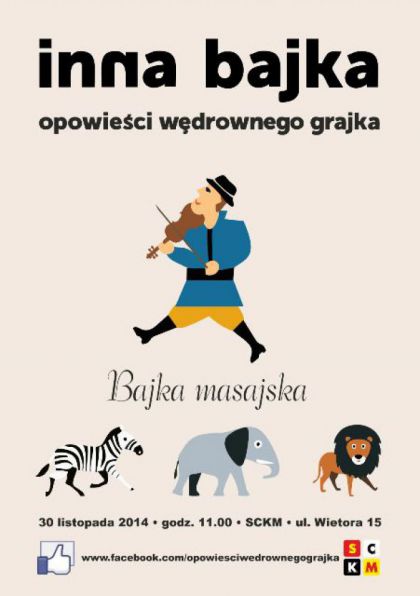 Wędrowny Grajek i Bajarka Ola zapraszają dzieci na „Bajkę masajską”.