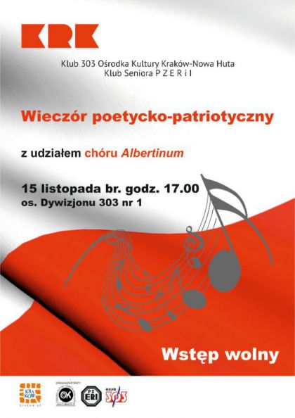 Klub 303 Ośrodka Kultury Kraków-Nowa Huta zaprasza na spotkanie z okazji rocznicy odzyskania niepodległości, przygotowane dla członków Klubu Seniora i mieszkańców pobliskich osiedli. W programie wieczoru wystąpi chór Albertinum.