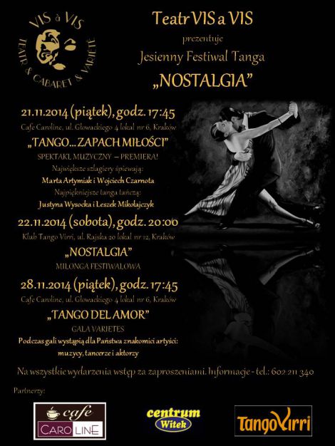 NOSTALGIA to pierwszy w Krakowie, kameralny festiwal poświęcony tangu w wymiarze tańca, piosenki i literatury zapraszający publiczność do krainy pasji i namiętności.
