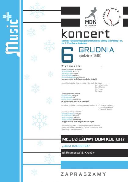 Serdecznie zapraszamy na kolejny z cyklu koncertów kameralnych organizowanych w ramach projektu MUSIC+. Wykonawcami koncertu będą uczniowie Państwowej Ogólnokształcącej Szkoły Muzycznej II st. im. F. Chopina w Krakowie. Projekt realizowany jest ze środków unijnych i ma na celu popularyzację edukacji muzycznej i tanecznej w różnych środowiskach. Koncerty stwarzają możliwość uczestniczenia w żywej kulturze muzycznej wszystkim melomanom. Organizatorem wydarzenia jest Młodzieżowy Dom Kultury "Dom Harcerza", ul. Reymonta 18.